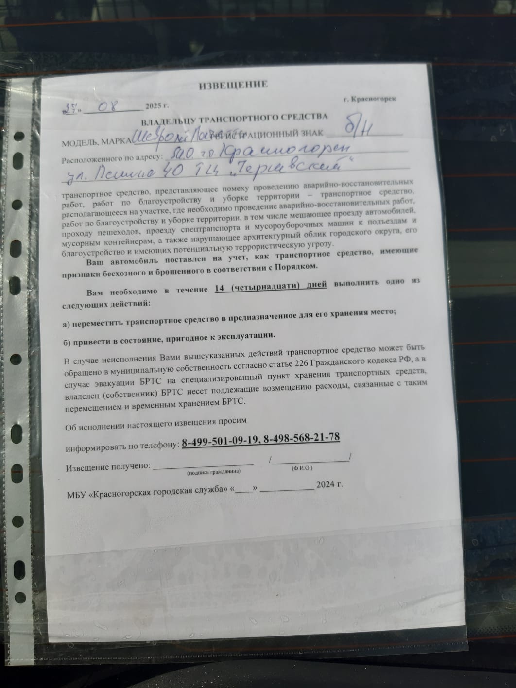 В соответствии с Решением Совета депутатов от 27.06.2024 года № 157/11 «Об утверждении Порядка выявления, перемещения, временного хранения и утилизации брошенных (бесхозяйных) транспортных средств транспортных средств, представляющих помеху проведению аварийно-восстановительных работ, работ по благоустройству и уборке на территории городского округа Красногорск Московской области» уполномоченным органом администрации городского округа Красногорск 25.09.2025г. проведены мероприятия по эвакуации брошенного (бесхозяйного) и разукомплектованного транспортного средства (далее – БРТС):