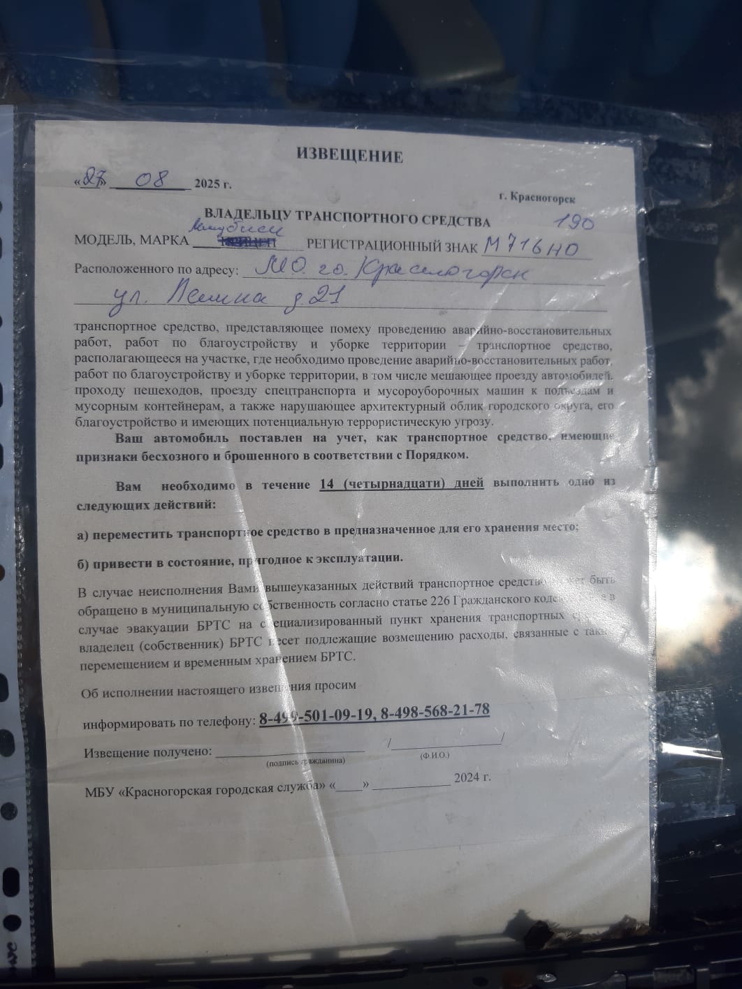 Кроме того, информируем о том, что транспортные средства могут быть обращены в муниципальную собственность согласно статье 226 Гражданского кодекса Российской Федерации.