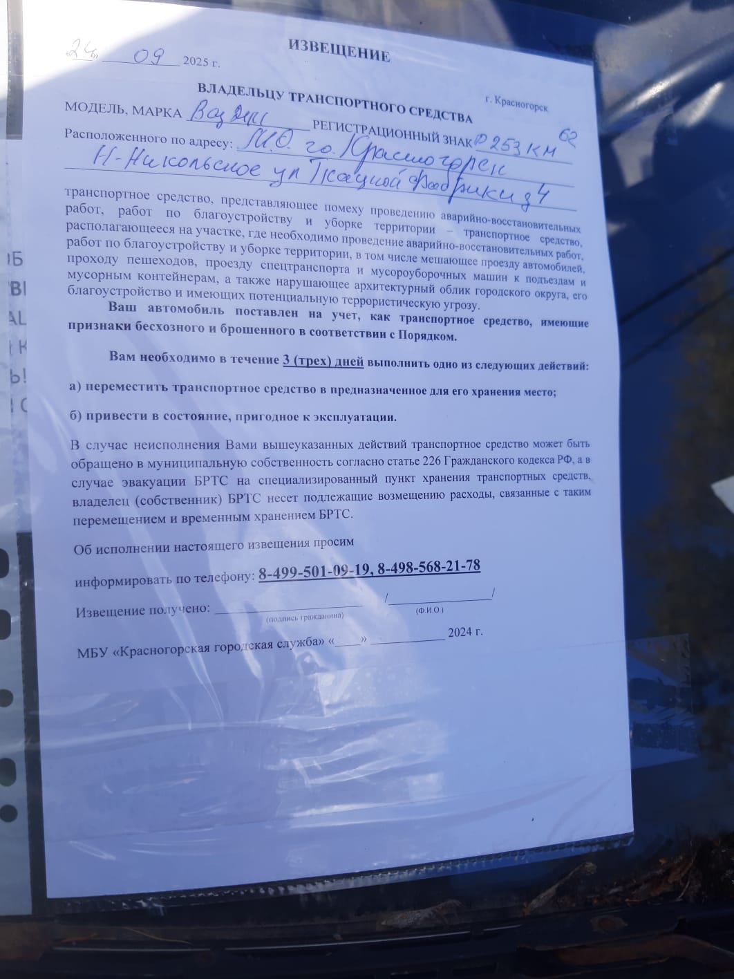 Кроме того, информируем о том, что транспортные средства могут быть обращены в муниципальную собственность согласно статье 226 Гражданского кодекса Российской Федерации.