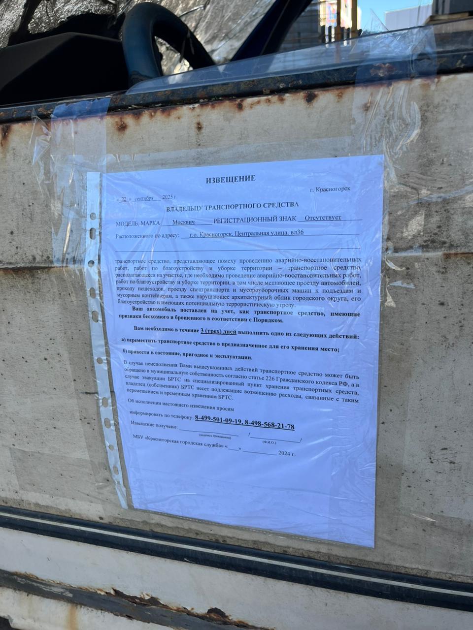В соответствии с Решением Совета депутатов от 27.06.2024 года № 157/11 «Об утверждении Порядка выявления, перемещения, временного хранения и утилизации брошенных (бесхозяйных) транспортных средств транспортных средств, представляющих помеху проведению аварийно-восстановительных работ, работ по благоустройству и уборке на территории городского округа Красногорск Московской области» уполномоченным органом администрации городского округа Красногорск 30.09.2025г. проведены мероприятия по эвакуации брошенного (бесхозяйного) и разукомплектованного транспортного средства (далее – БРТС):