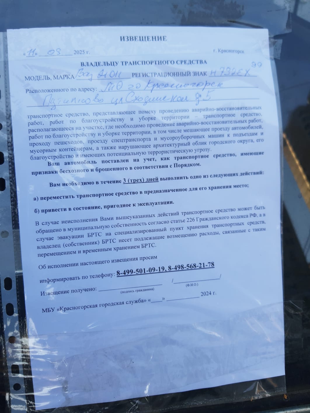 Кроме того, информируем о том, что транспортные средства могут быть обращены в муниципальную собственность согласно статье 226 Гражданского кодекса Российской Федерации.