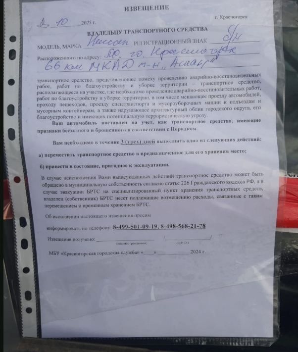 Кроме того, информируем о том, что транспортные средства могут быть обращены в муниципальную собственность согласно статье 226 Гражданского кодекса Российской Федерации.