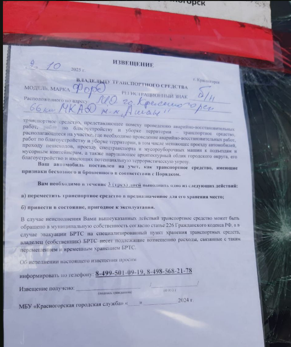 В соответствии с Решением Совета депутатов от 27.06.2024 года № 157/11 «Об утверждении Порядка выявления, перемещения, временного хранения и утилизации брошенных (бесхозяйных) транспортных средств транспортных средств, представляющих помеху проведению аварийно-восстановительных работ, работ по благоустройству и уборке на территории городского округа Красногорск Московской области» уполномоченным органом администрации городского округа Красногорск 05.10.2025г. проведены мероприятия по эвакуации брошенного (бесхозяйного) и разукомплектованного транспортного средства (далее – БРТС):