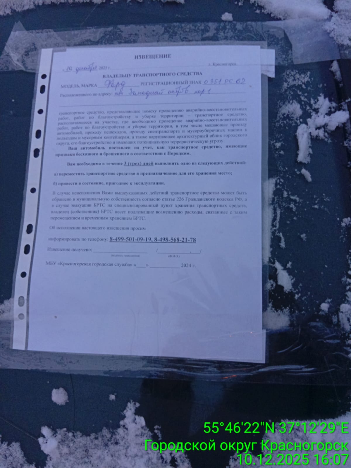 - Акт № 93/25 от 15.12.2025г. автомобиля Форд с государственным регистрационным знаком О351РС62, расположенного по адресу: МО, г. о. Красногорск, ЖК «Западный остров».