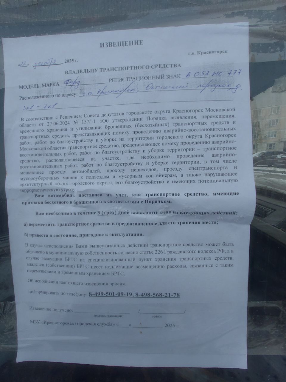 В соответствии с Решением Совета депутатов от 27.06.2024 года № 157/11 «Об утверждении Порядка выявления, перемещения, временного хранения и утилизации брошенных (бесхозяйных) транспортных средств транспортных средств, представляющих помеху проведению аварийно-восстановительных работ, работ по благоустройству и уборке на территории городского округа Красногорск Московской области» уполномоченным органом администрации городского округа Красногорск 25.12.2025г. проведены мероприятия по эвакуации брошенного (бесхозяйного) и разукомплектованного транспортного средства (далее – БРТС):