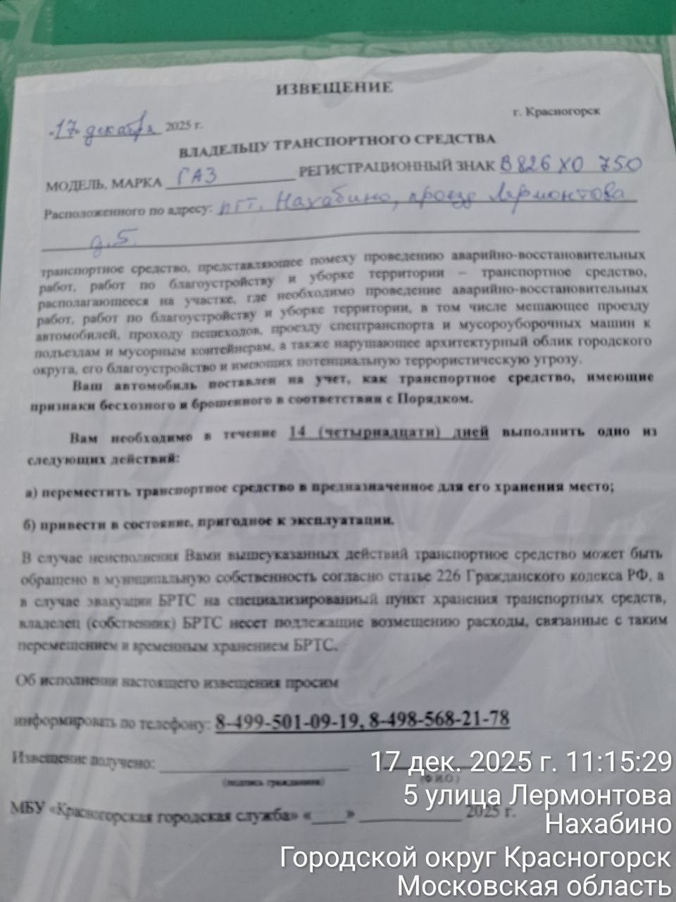 - Акт № 1/26 от 26.01.2026г. ГАЗ с государственным регистрационным знаком В826ХО750, расположенного по адресу: МО, г.о. Красногорск, пгт Нахабино, проезд Лермонтова, д.5.