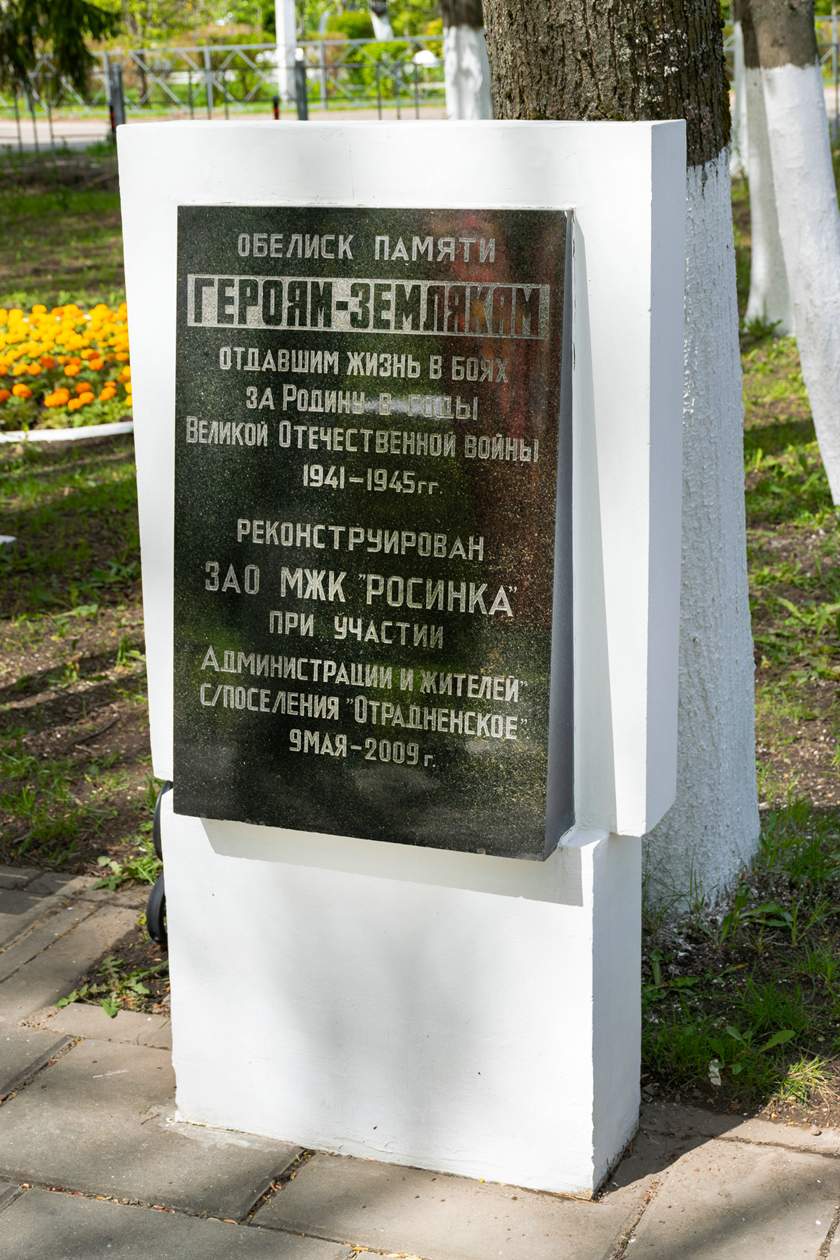 Ныне на памятнике следующая надпись: «Обелиск памяти. Героям-землякам, отдавшим жизнь в боях за Родину в годы Великой Отечественной войны 1941-1945 гг. Реконструирован ЗАО МЖК «Росинка» при участии администрации и жителей с/поселения Отрадненское. 9 мая 2009г.»