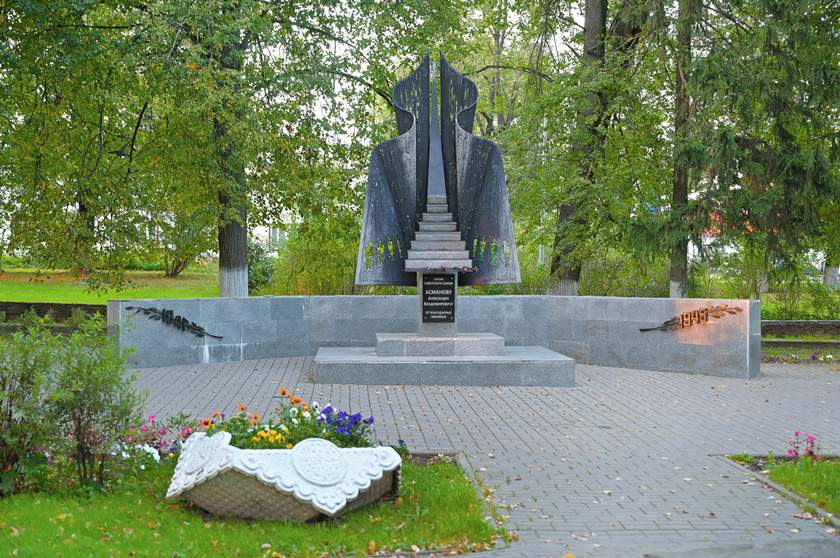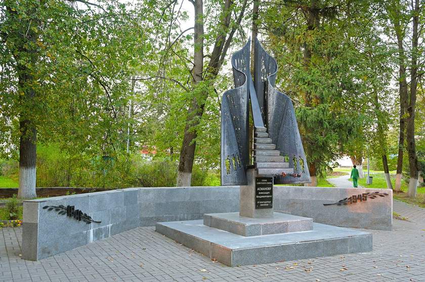 К началу пути ведут 8 ступеней, на каждой из которых выкованы фамилия и имя зенитчика орудийного расчета, в том числе и младшего сержанта Александра Асманова. Высота обелиска – 3м, вес металлической конструкции 300 кг.